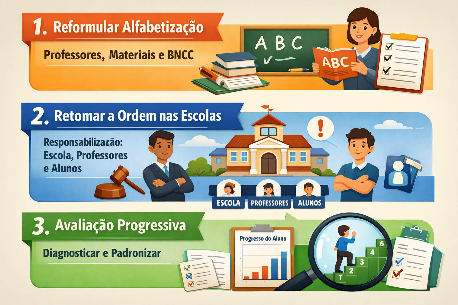 3. Nas ultimas décadas criamos um novo tipo de analfabetismo, o analfabetismo funcional, que hoje domina aproximadamente 30% da população. Para resolver isso, não basta alterar o método de ensino. Vamos ter também que criar um sistema Brasileiro, parecido com o que existe em todo o primeiro mundo, que é basicamente a implementação de um grande sistema de Avaliação progressiva. A avaliação progressiva é um método contínuo e padronizado de medir o aprendizado dos estudantes ao longo do tempo, identificando com precisão em quais competências cada aluno está avançando ou estagnado. Para o estudante, ela permite receber materiais e atividades personalizados para maximizar seu progresso; para a escola, oferece dados claros para ajustar metodologias e identificar áreas problemáticas; para o Estado, gera indicadores confiáveis sobre a efetividade das políticas educacionais; e para a família, fornece informações transparentes sobre o desempenho do filho, facilitando acompanhamento e apoio em casa.